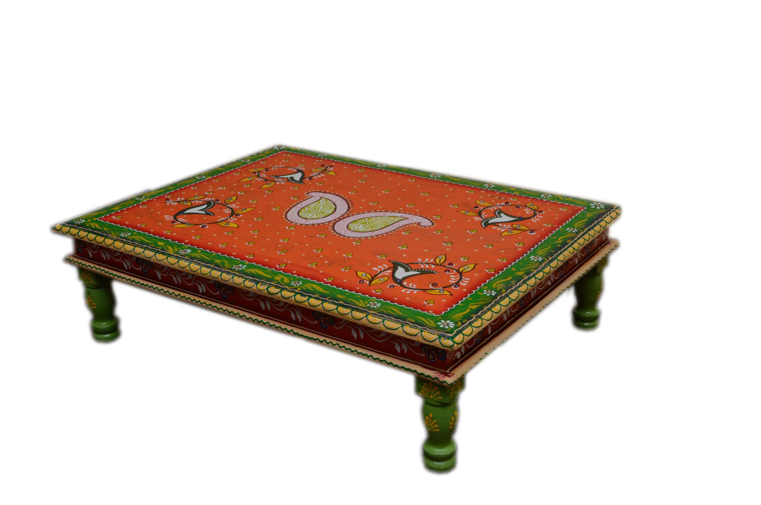 Bring home the timeless spirit of traditional Indian craftsmanship with the Peacock Motif Heritage Hand-Painted Chowki Table, a radiant piece that beautifully blends culture, color, and artistry. Hand-crafted from solid wood, this chowki features a vibrant deep orange top adorned with two elegant paisley motifs at the center—symbols of prosperity, harmony, and auspicious beginnings. Surrounding the centerpiece are beautifully illustrated folk-style birds, their delicate detailing adding life and movement to the design.